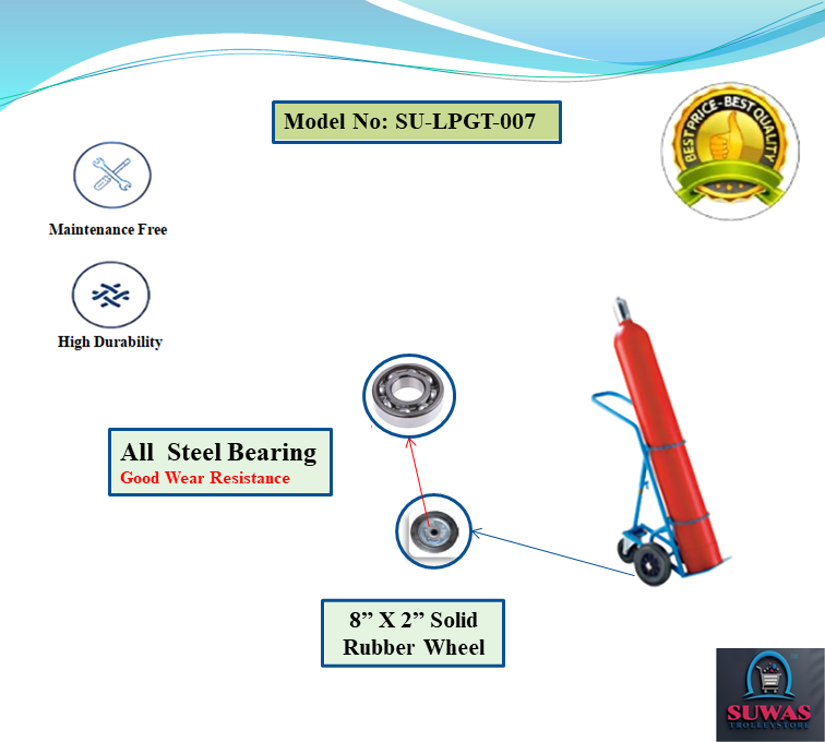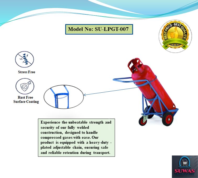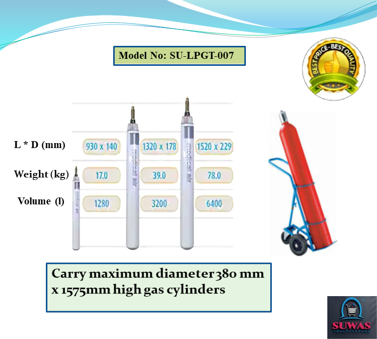 Cylinder trolleys with tubular steel frame designed to carry maximum 380mm diameter x 1575mm high gas cylinders. Gas cylinder trolley frames are fitted with locking chain increased manoeuvrability and stability when in transit.