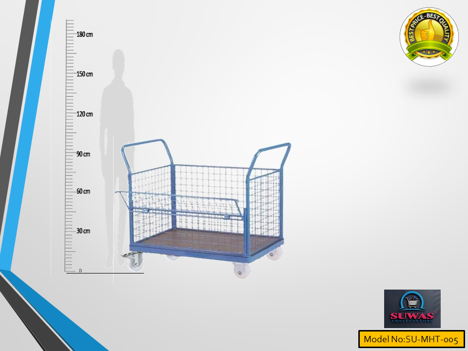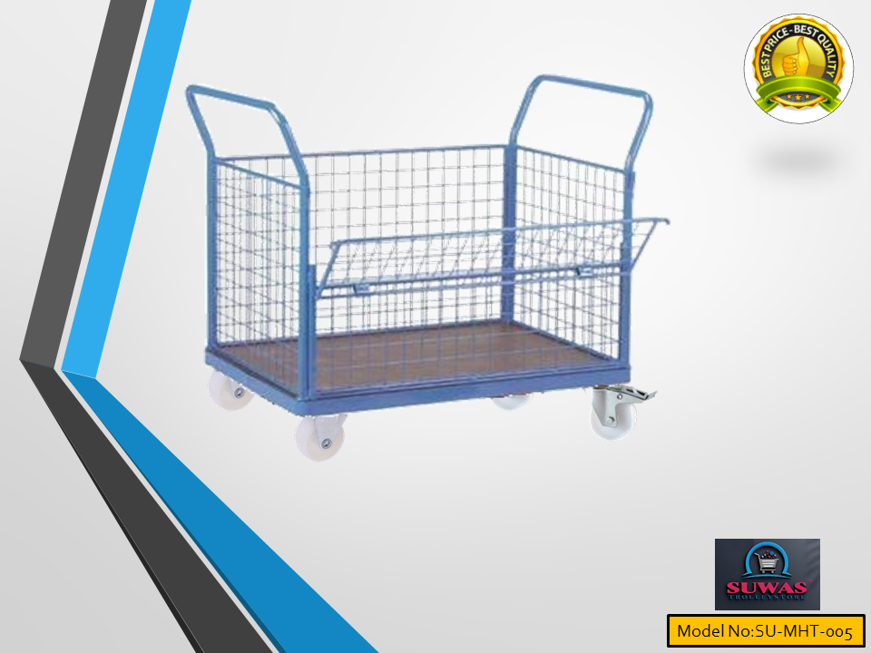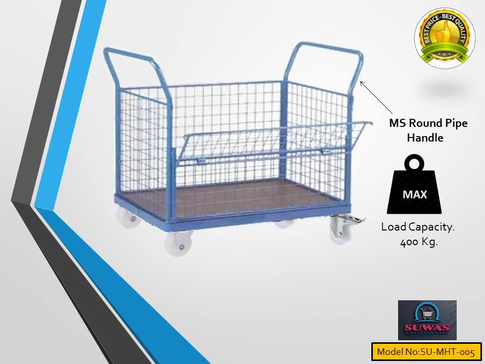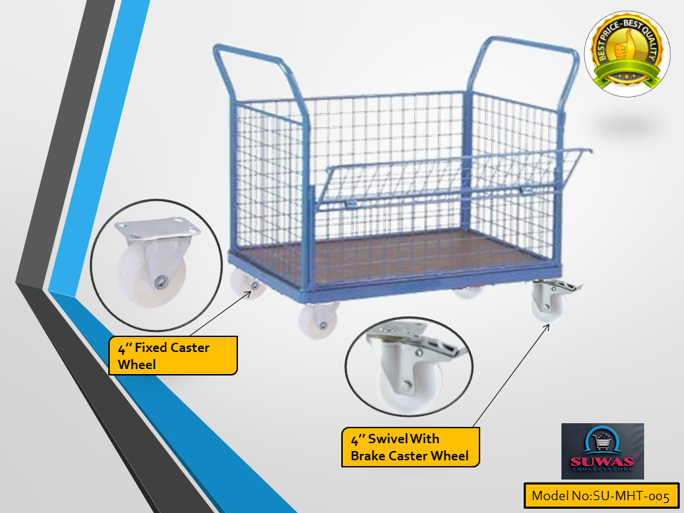 Strong & durable mild steel heavy duty Material Handling Trolley. Trolley engaged with 4” x 2” PP (Polypropylene) fixed Castor wheels at front & swivel with brake castor wheel at rear end for indoor and moderate outdoor easy & safe handling. Tubing and each shelf made of tough steel for added durability.
