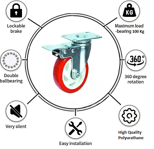 4” x 1.5” 100Kg. Loading Capacity PU Swivel With Brake CastorWheel