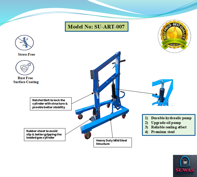 Cylinder trolley with mild steel frame designed to carry maximum 286mm diameter x 1575mm high gas cylinders. Gas cylinder trolley frames are fitted with Rachet Belt increased manoeuvrability and stability when in transit. This trolley is raised with a foot pedal and can be proportionally lowered with a hand lever.
