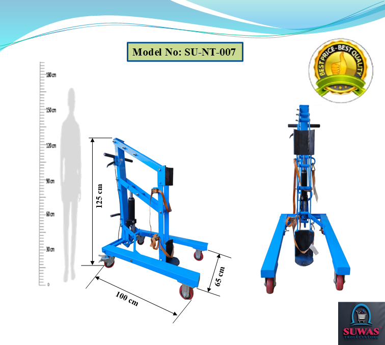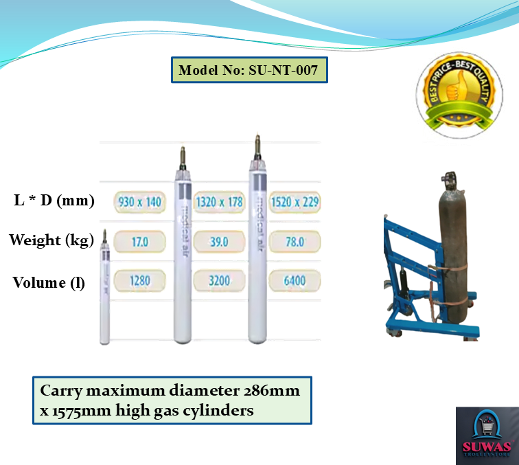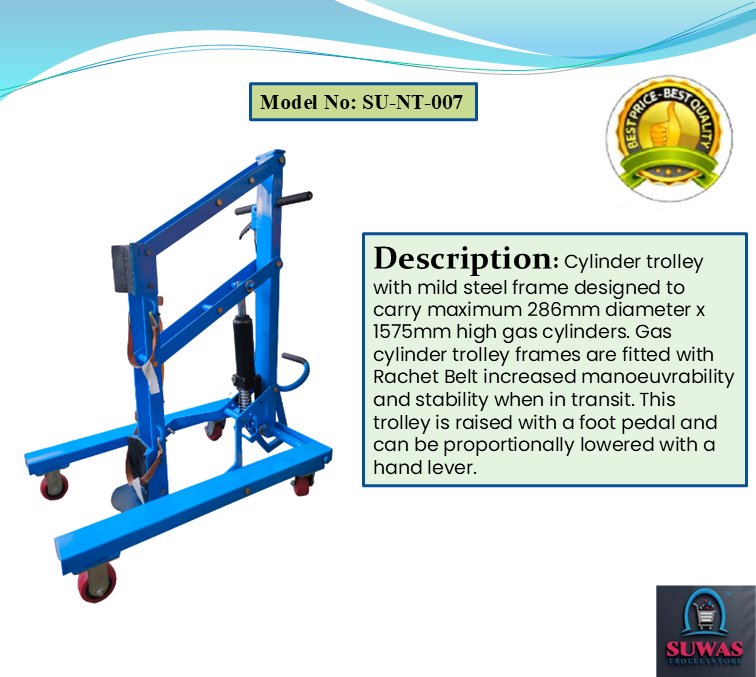 Cylinder trolley with mild steel frame designed to carry maximum 286mm diameter x 1575mm high gas cylinders. Gas cylinder trolley frames are fitted with Rachet Belt increased manoeuvrability and stability when in transit. This trolley is raised with a foot pedal and can be proportionally lowered with a hand lever.