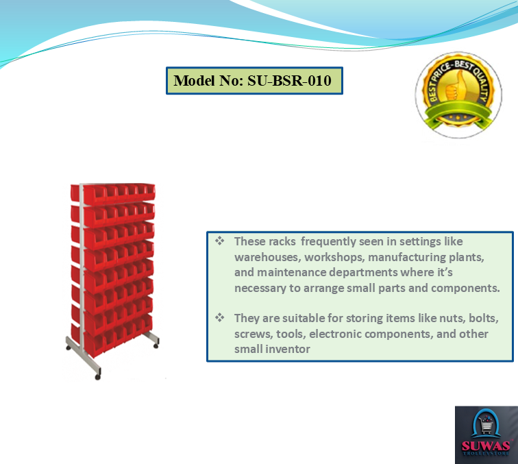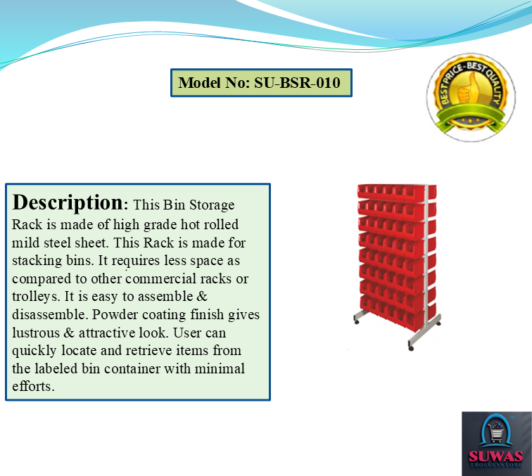 This rack is made of high grade hot rolled mild steel sheet. This rack is made for stacking bins. It requires less as compared to other commercial racks. It is easy to assemble & disassemble. Powder coating finish gives lustrous & attractive look.