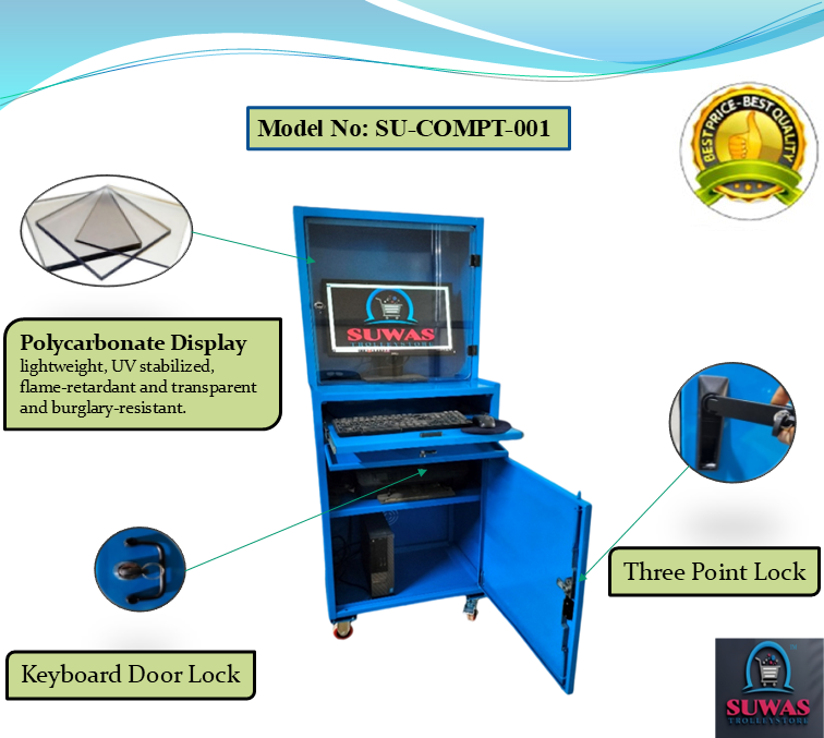 Computer trolley made with high grade steel sheet with the extraordinary design with the attractive features. This model of computer trolley have cabin for the monitor with lock, keyboard sliding tray with extra space to move mouse easily & printer shelf & CPU cabin at the bottom. All cabinet having locking security. 3" Swivel & brake wheel to move easily trolley from one place to anywhere in shop floor on smooth & mild rough surface.