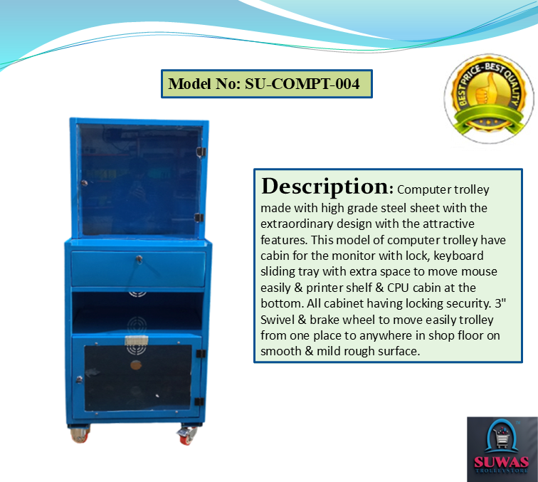 Computer trolley made with high grade steel sheet with the extraordinary design with the attractive features. This model of computer trolley have cabin for the monitor with lock, keyboard sliding tray with extra space to move mouse easily & printer shelf & CPU cabin at the bottom. All cabinet having locking security. 3" Swivel & brake wheel to move easily trolley from one place to anywhere in shop floor on smooth & mild rough surface.