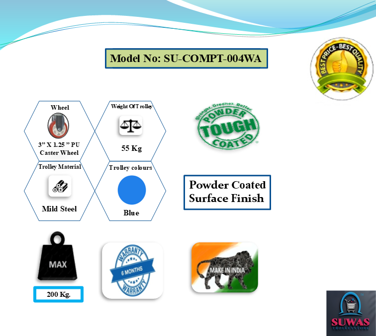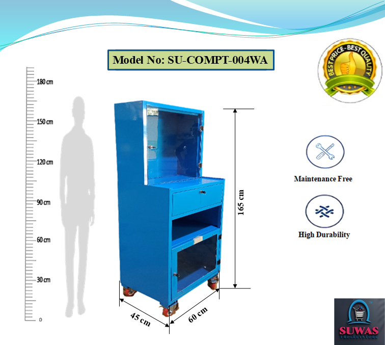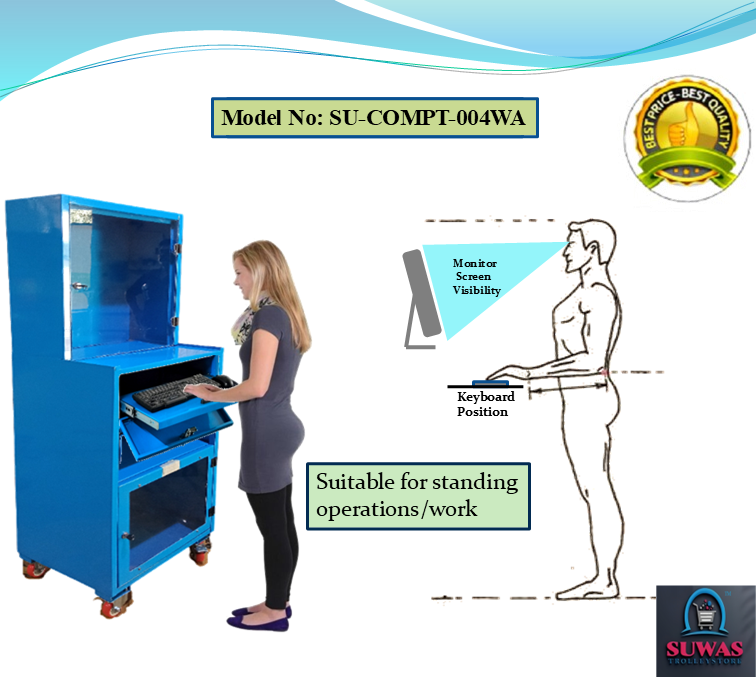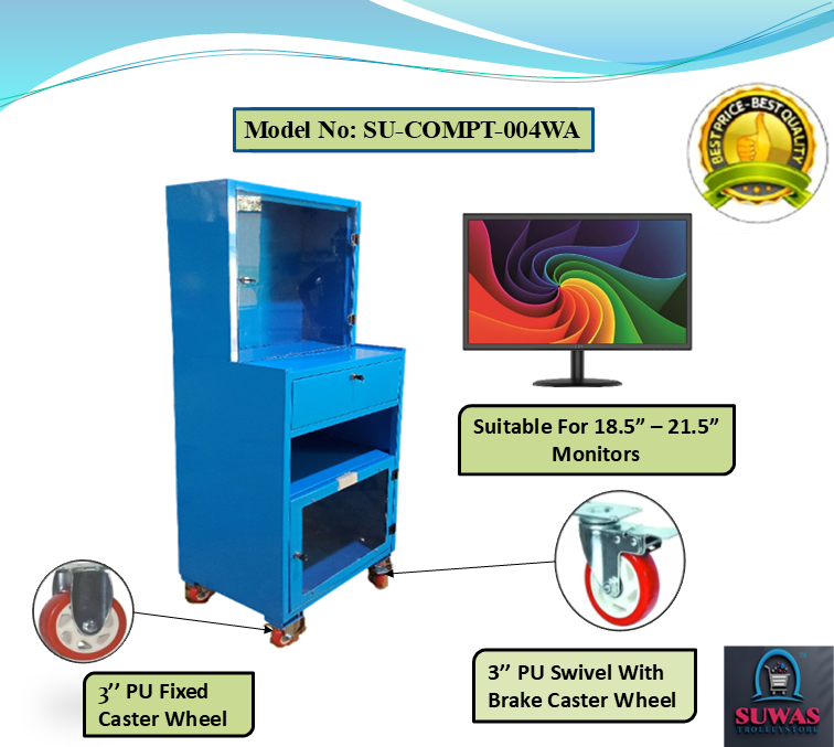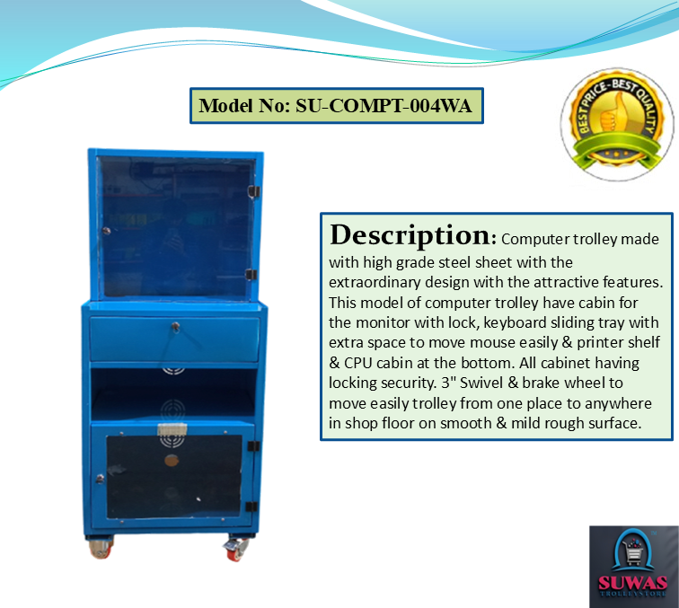 Computer trolley made with high grade steel sheet with the extraordinary design with the attractive features. This model of computer trolley have cabin for the monitor with lock, keyboard sliding tray with extra space to move mouse easily & printer shelf & CPU cabin at the bottom. All cabinet having locking security. 3" Swivel & brake wheel to move easily trolley from one place to anywhere in shop floor on smooth & mild rough surface.