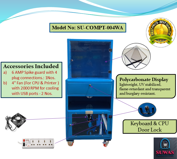 6 AMP Spike guard with 4 plug connections.: 1Nos. 4" Fan (For CPU & Printer ) with 2000 RPM for cooling with USB ports - 2 Nos. |