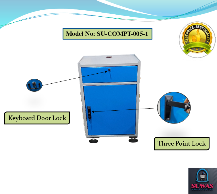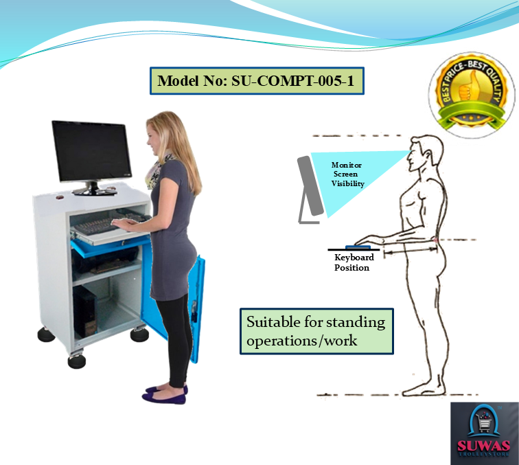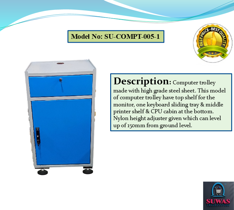 Computer trolley made with high grade steel sheet. This model of computer trolley have top shelf for the monitor, one keyboard sliding tray & middle printer shelf & CPU cabin at the bottom. Nylon height adjuster given which can level up of 150mm from ground level.