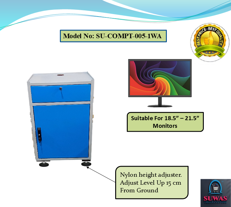 : Computer trolley made with high grade steel sheet. This model of computer trolley have top shelf for the monitor, one keyboard sliding tray & middle printer shelf & CPU cabin at the bottom. Nylon height adjuster given which can level up of 150mm from ground level.