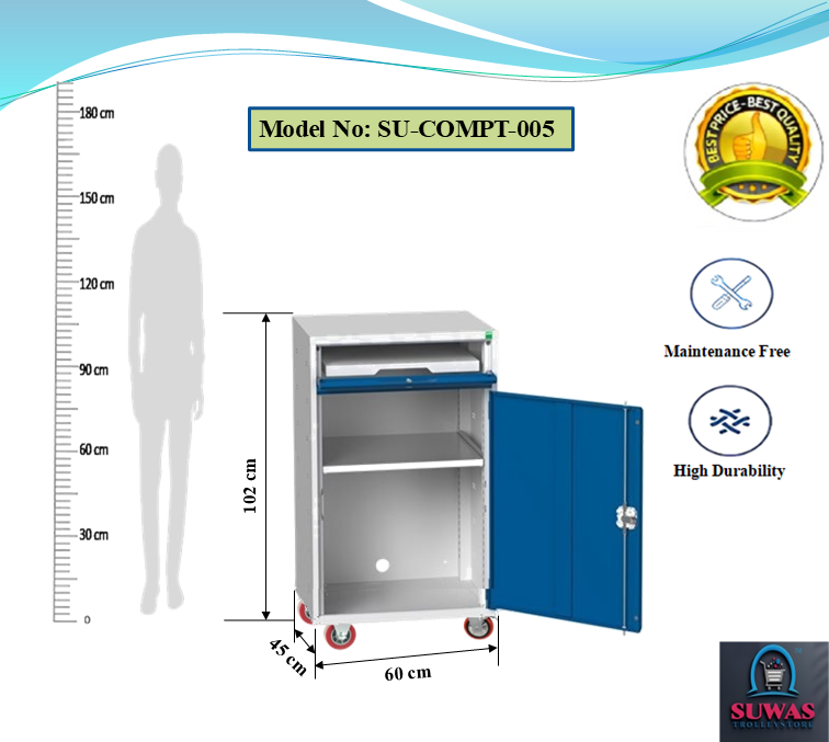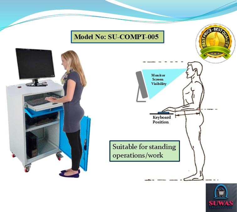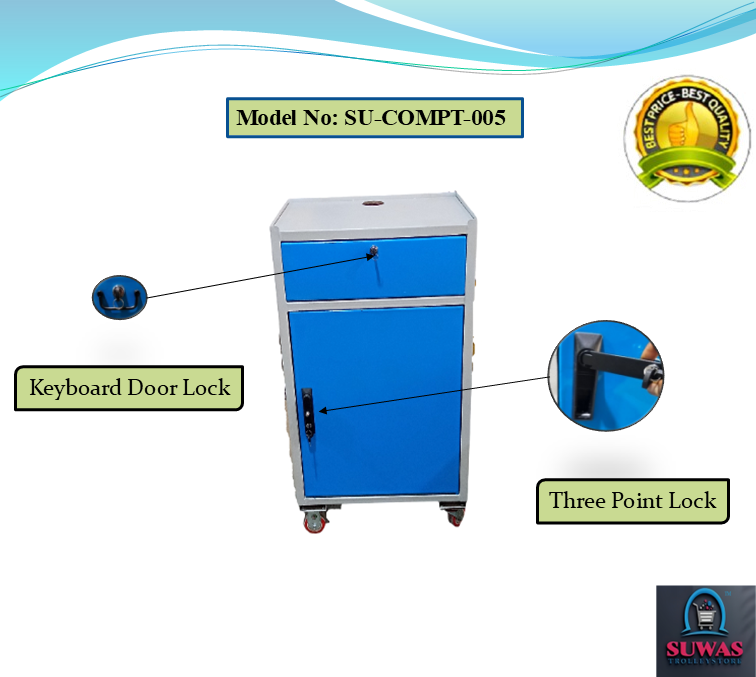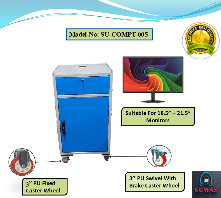 Computer trolley made with high grade steel sheet with the extraordinary design with the attractive features. This model of computer trolley have cabin for the monitor with lock, keyboard sliding tray with extra space to move mouse easily & printer shelf & CPU cabin at the bottom. All cabinet having locking security. 3" Swivel & brake wheel to move easily trolley from one place to anywhere in shop floor on smooth & mild rough surface.