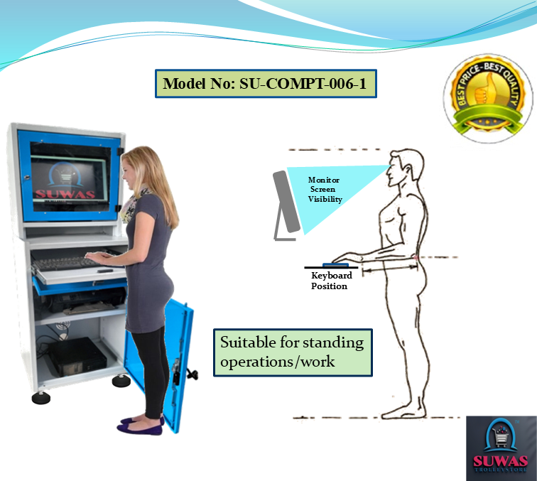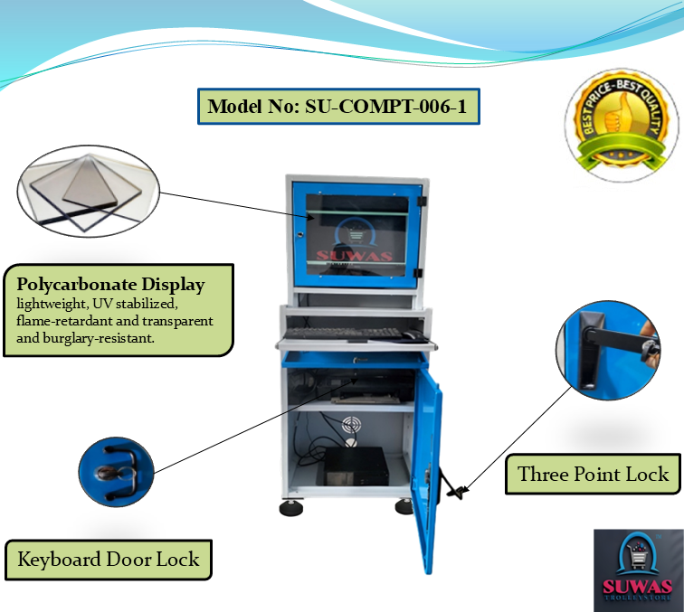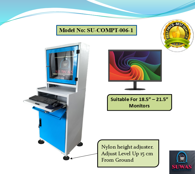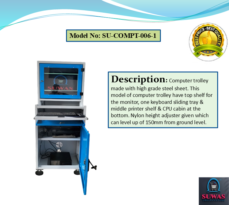 : Computer trolley made with high grade steel sheet. This model of computer trolley have top shelf for the monitor, one keyboard sliding tray & middle printer shelf & CPU cabin at the bottom. Nylon height adjuster given which can level up of 150mm from ground level.
