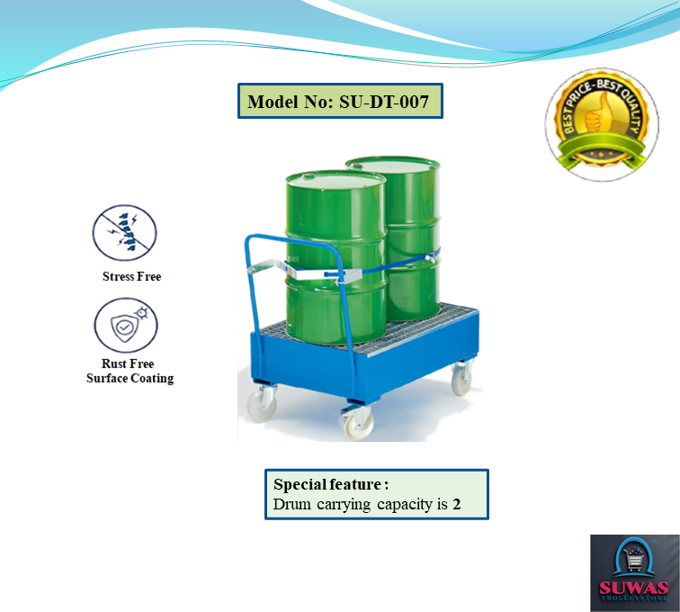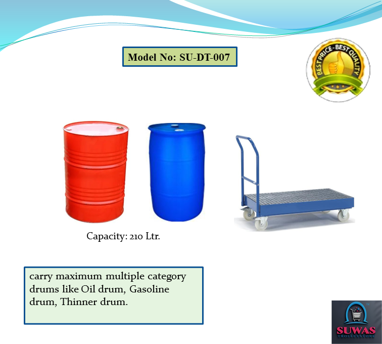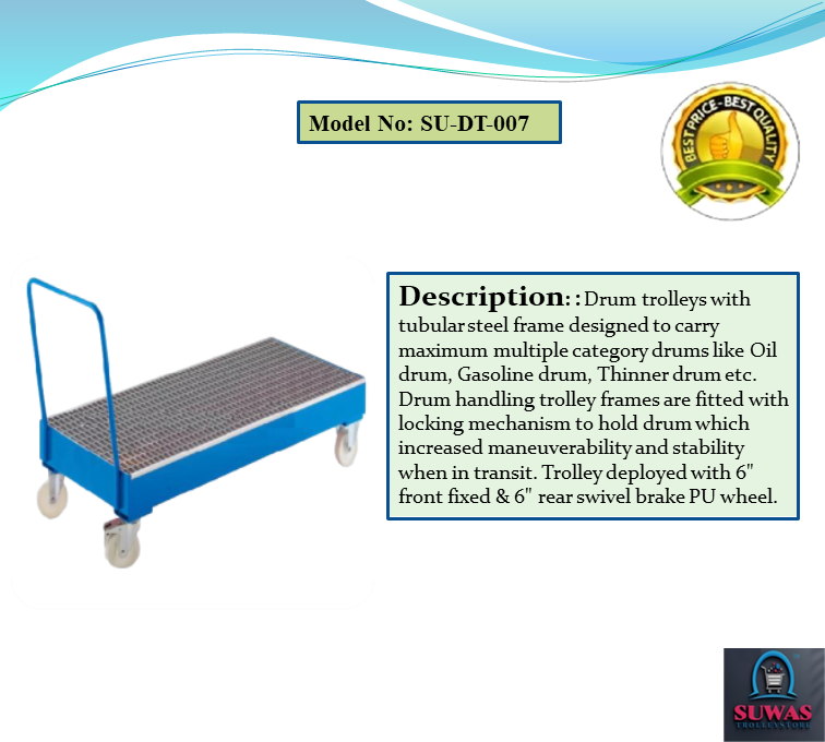 : Drum trolleys with tubular Mild steel frame designed to carry maximum multiple category drums like Oil drum, Gasoline drum, Thinner drum etc. Drum handling trolley frames are fitted with locking mechanism to hold drum which increased maneuverability and stability when in transit. Trolley deployed with 6" front fixed & 6" rear swivel brake PU wheel.