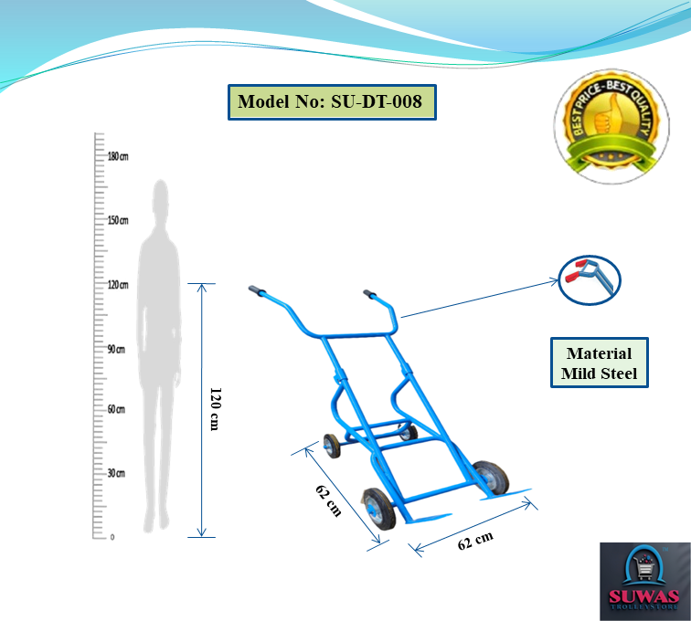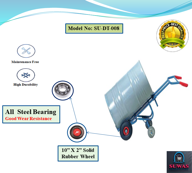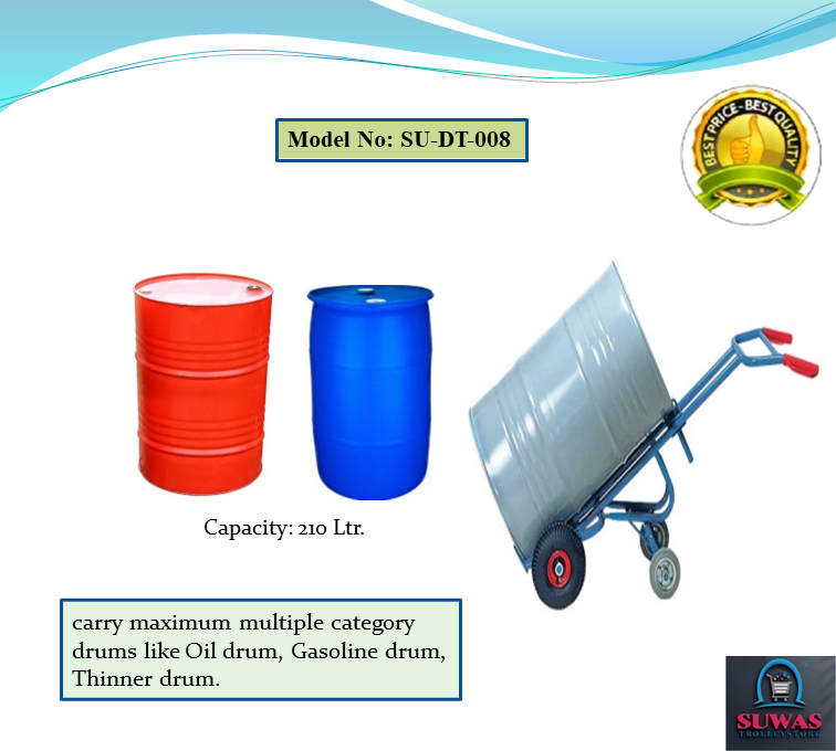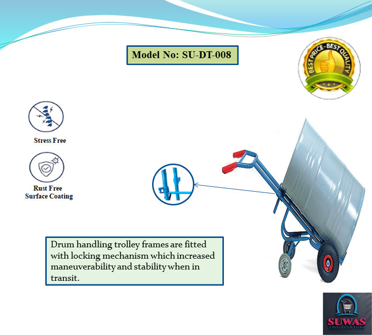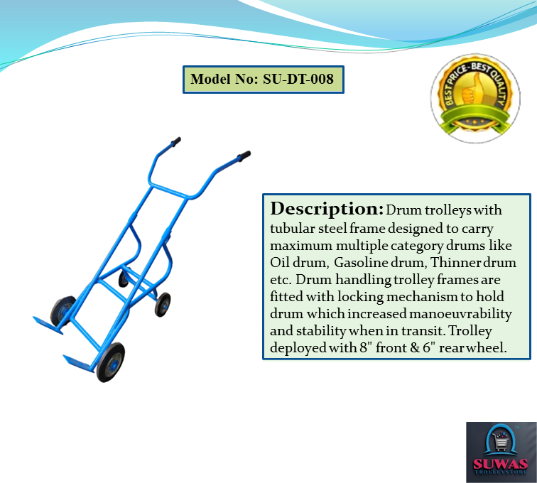 Drum trolleys with tubular Mild steel frame designed to carry maximum multiple category drums like Oil drum, Gasoline drum, Thinner drum etc. Drum handling trolley frames are fitted with locking mechanism to hold drum which increased maneuverability and stability when in transit. Trolley deployed with 8" front & 6" rear wheel.