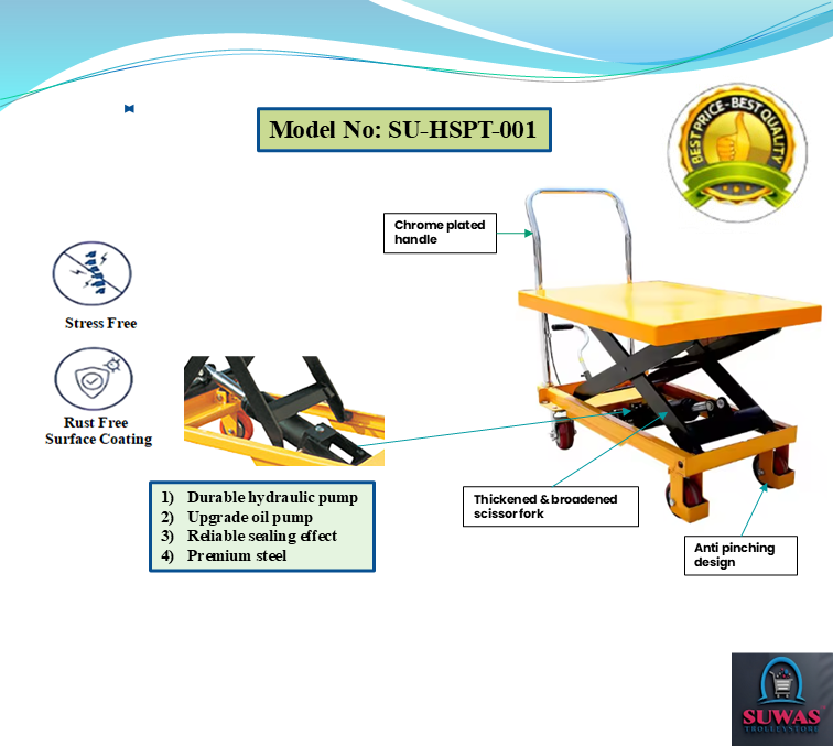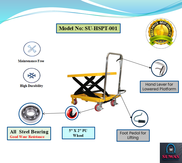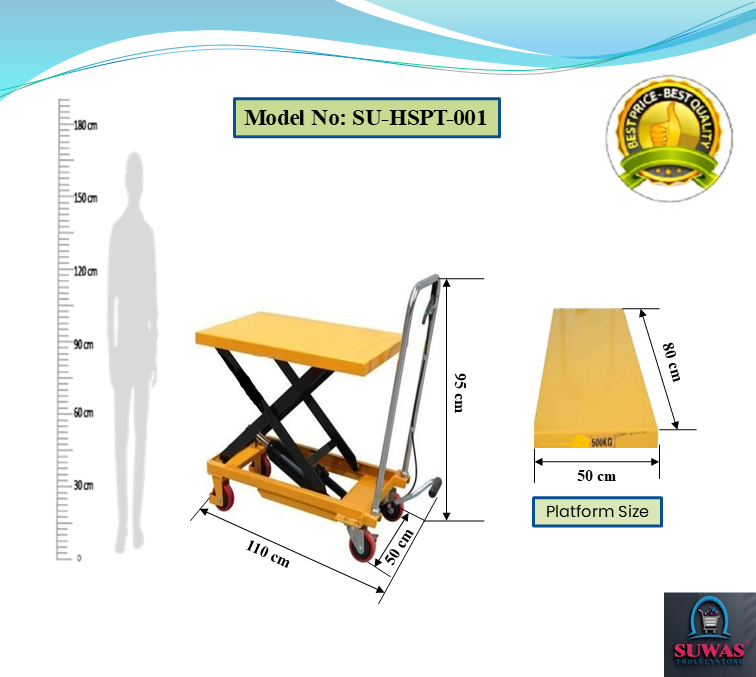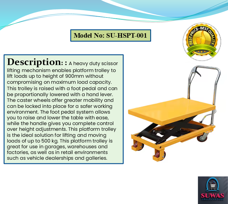 A heavy duty scissor lifting mechanism enables platform trolley to lift loads up to height of 900mm without compromising on maximum load capacity. This trolley is raised with a foot pedal and can be proportionally lowered with a hand lever. The caster wheels offer greater mobility and can be locked into place for a safer working environment. This platform trolley is the ideal solution for lifting and moving loads of up to 500 kg. This platform trolley is great for use in garages, warehouses and factories, as well as in retail environments such as vehicle dealerships and galleries