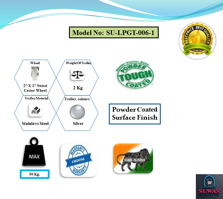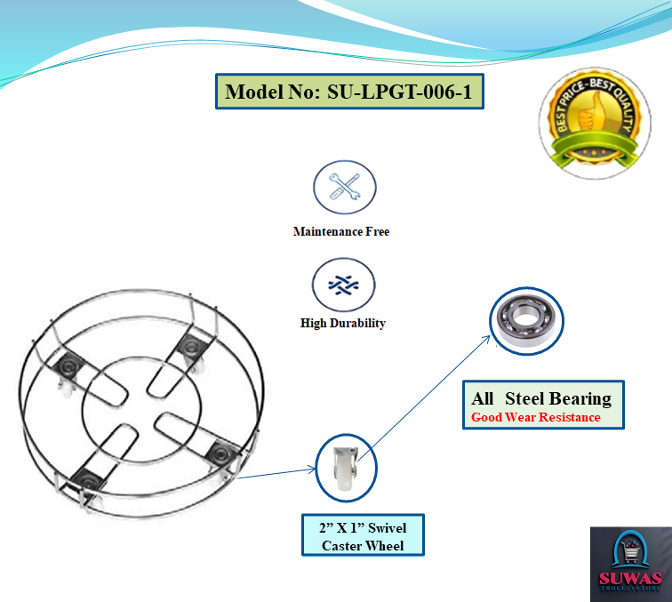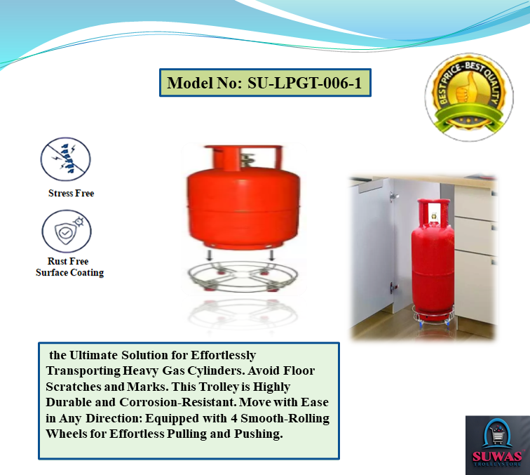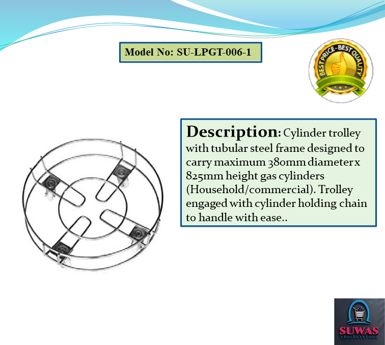 Cylinder trolley with tubular steel frame designed to carry maximum 380mm diameter x 825mm height gas cylinders (Household/commercial). Trolley engaged with cylinder holding chain to handle with ease.