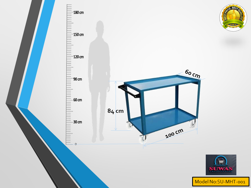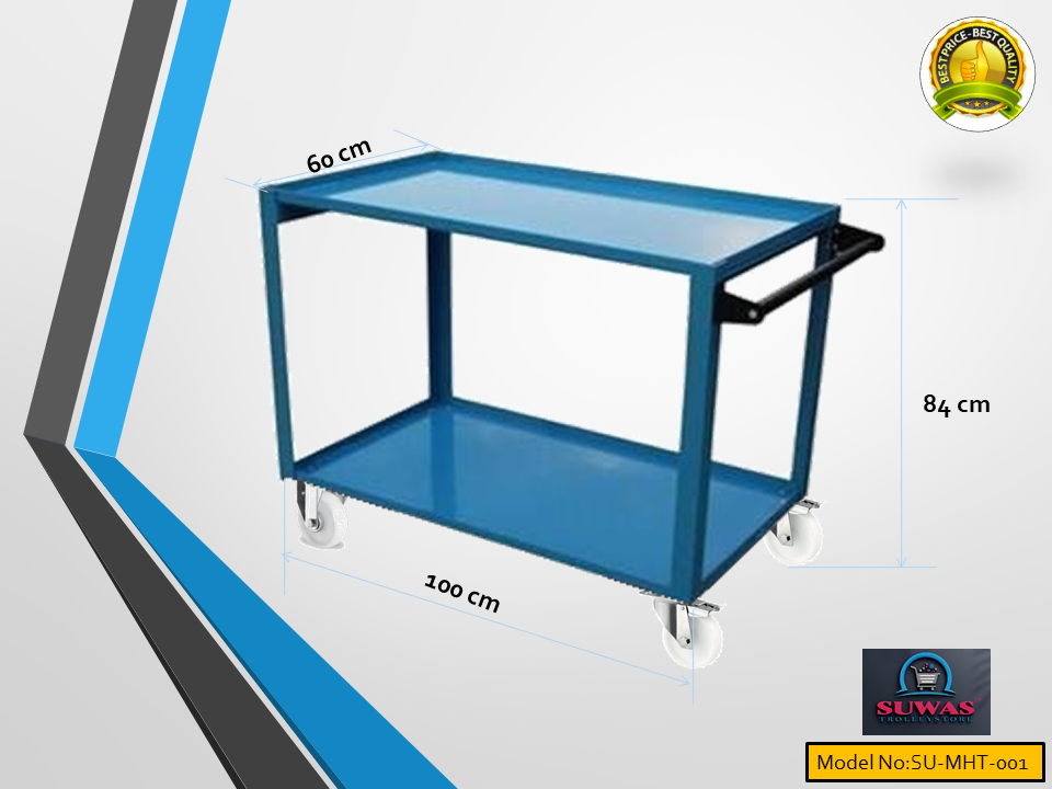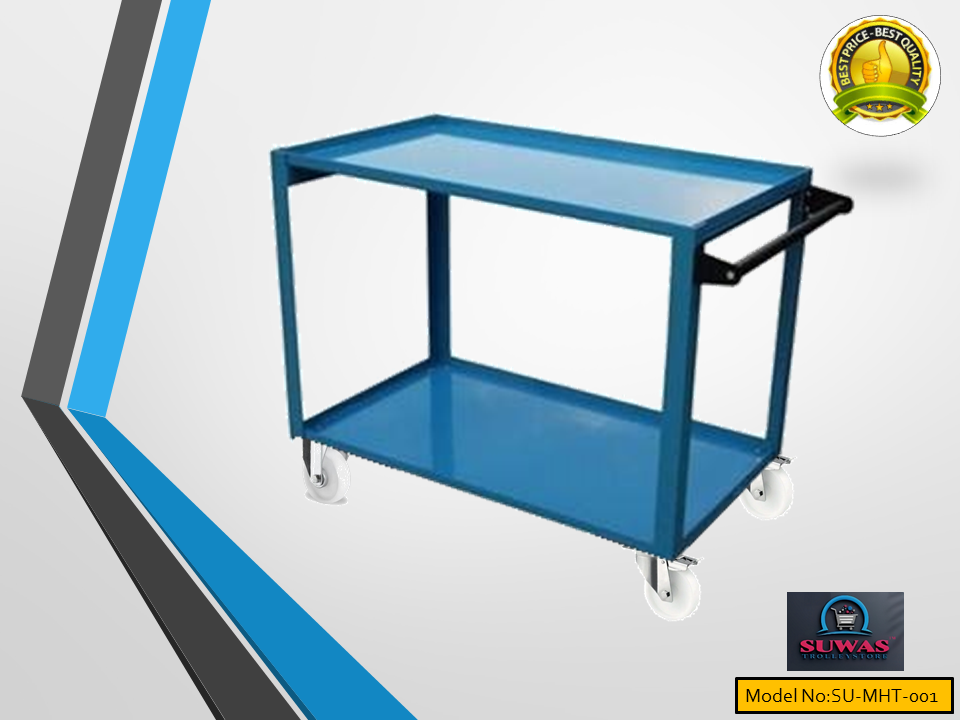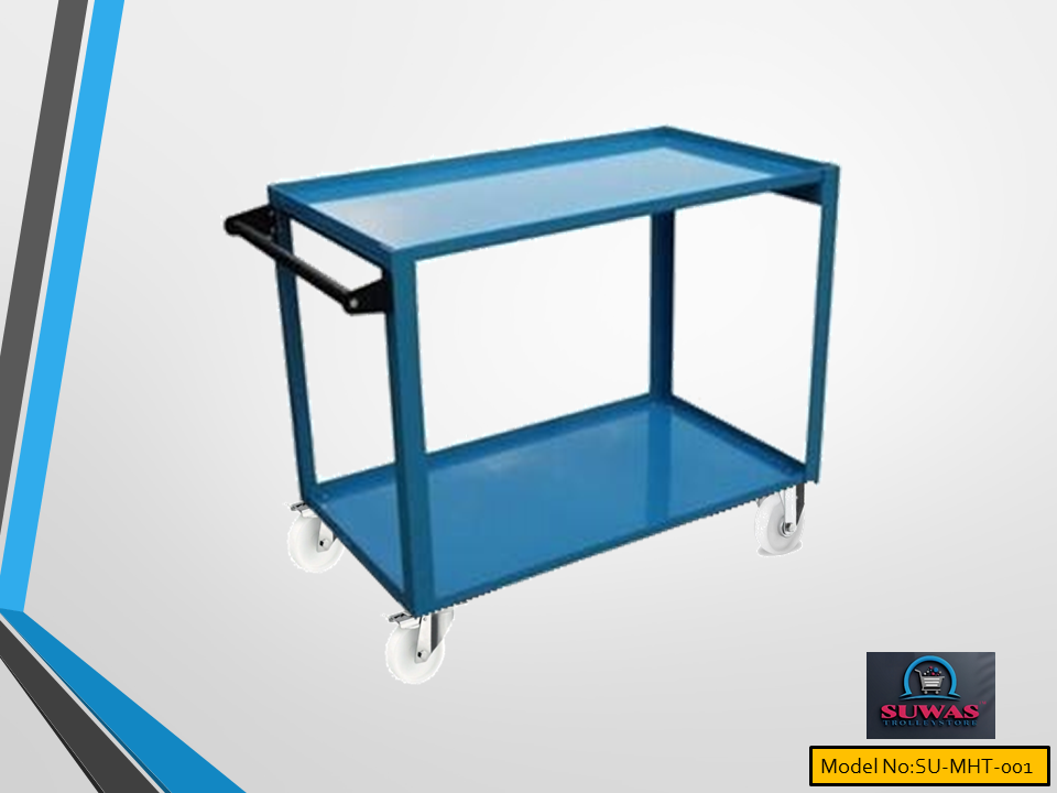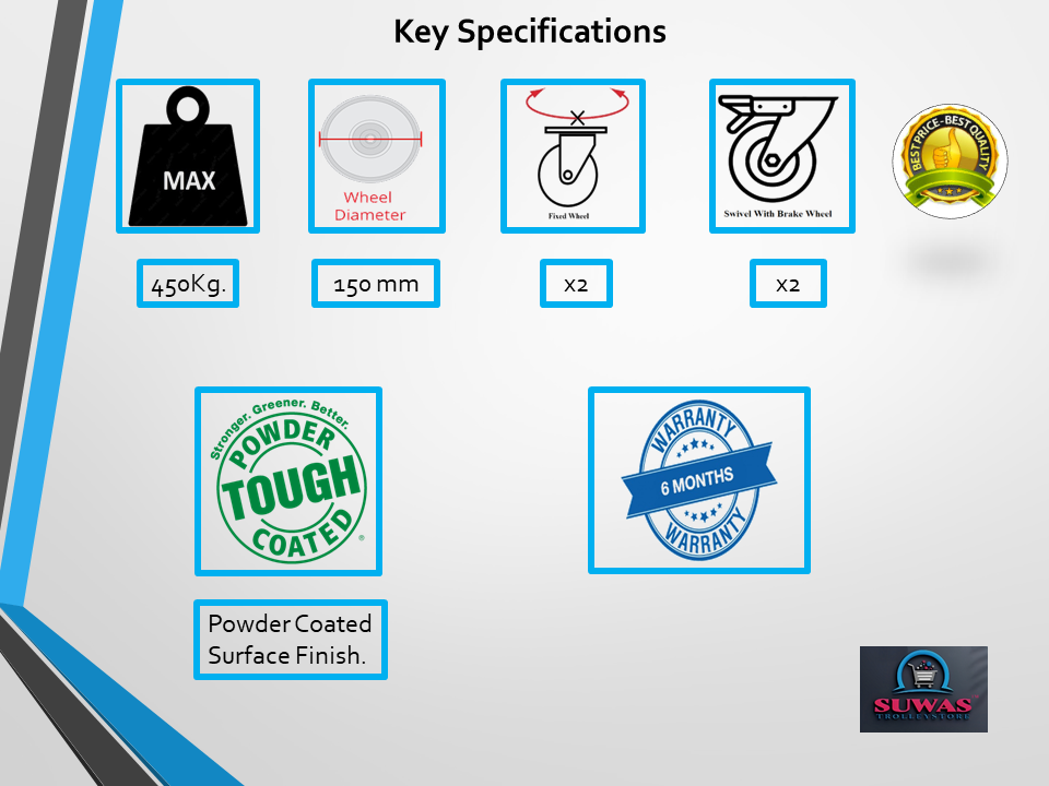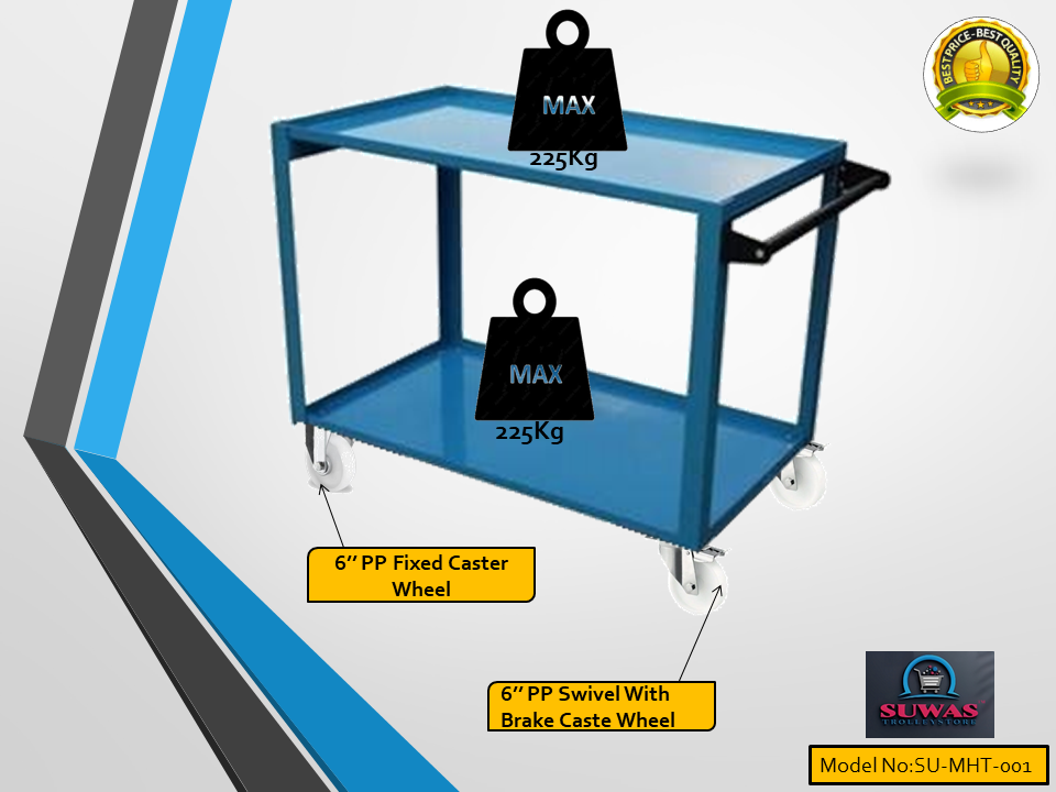 Strong & durable mild steel heavy duty Material Handling Trolley. Trolley engaged with 6” x 2” PP (Polypropylene) fixed Castor wheels at front & swivel with brake castor wheel at rear end for indoor and moderate outdoor easy & safe handling. Tubing and each shelf made of tough steel for added durability.