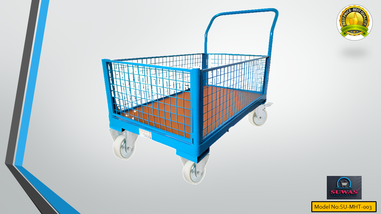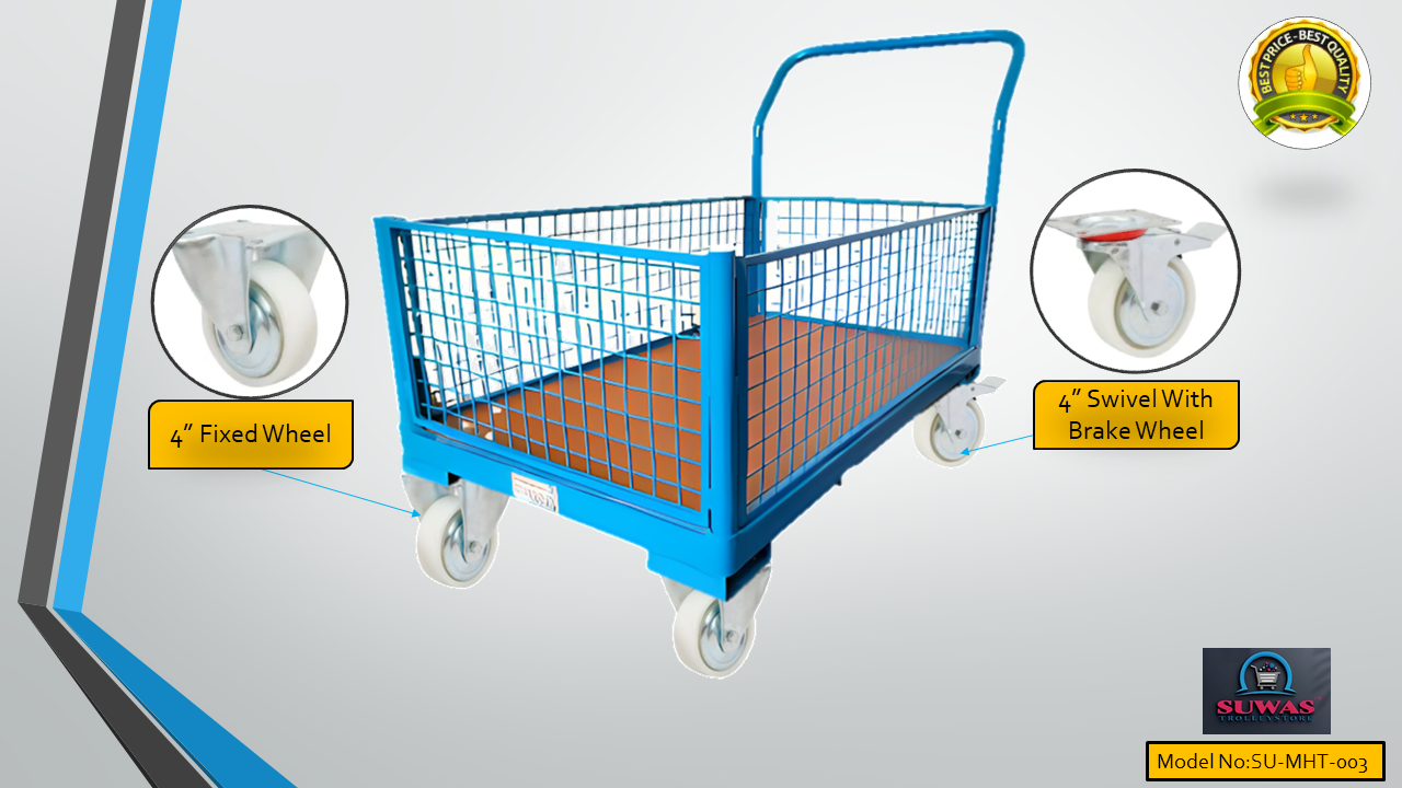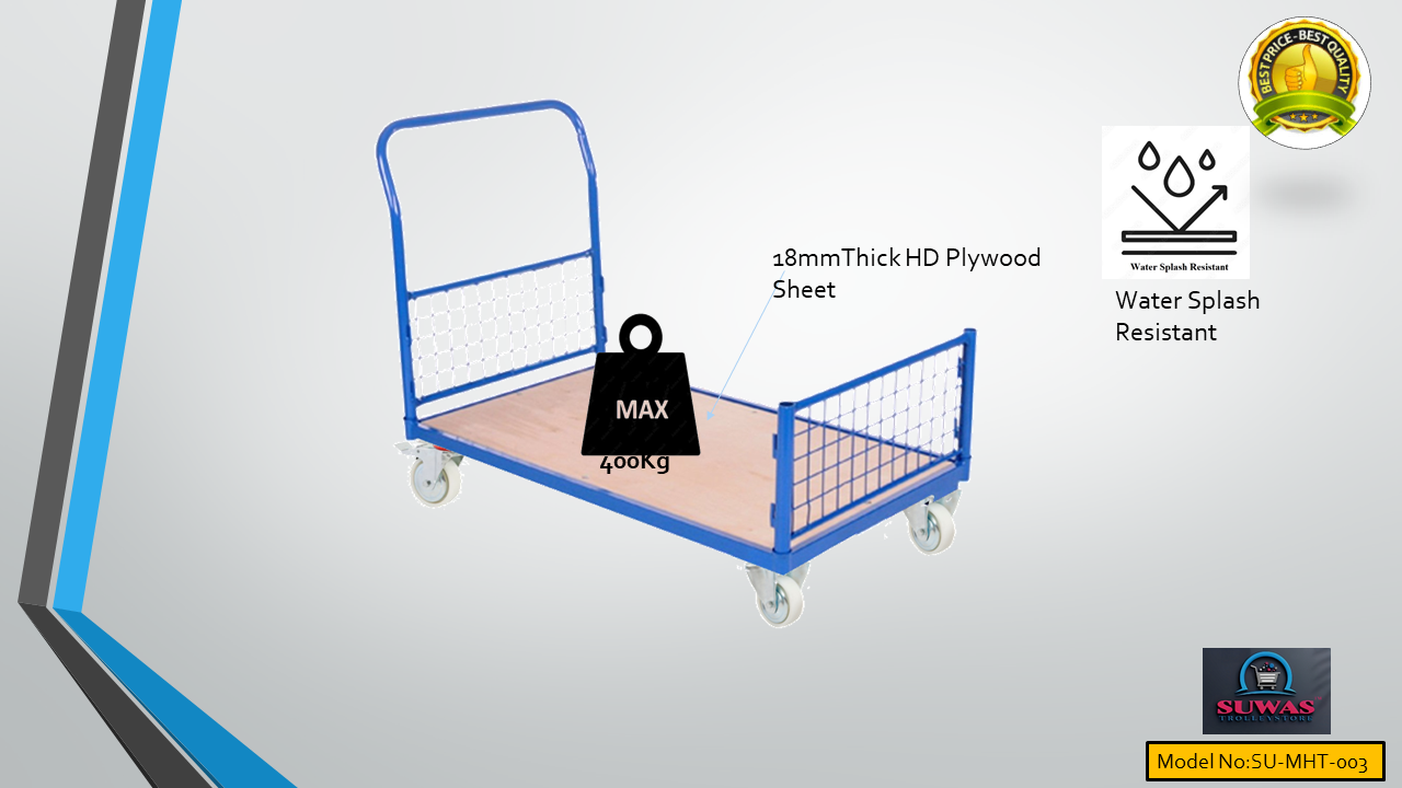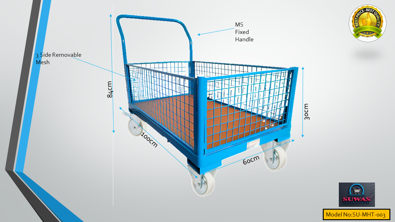 1) Fixed Handle 2) Removable side mesh. 3) 18mm High strength compressed plywood on platform. |