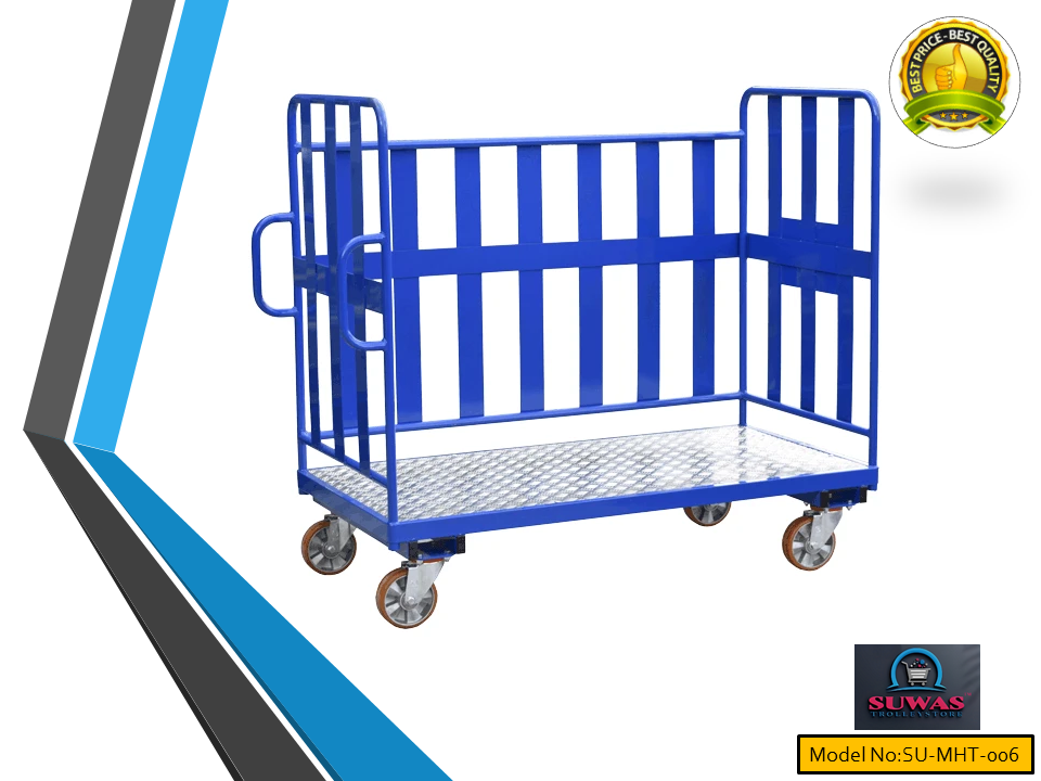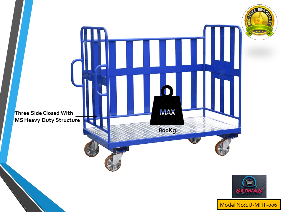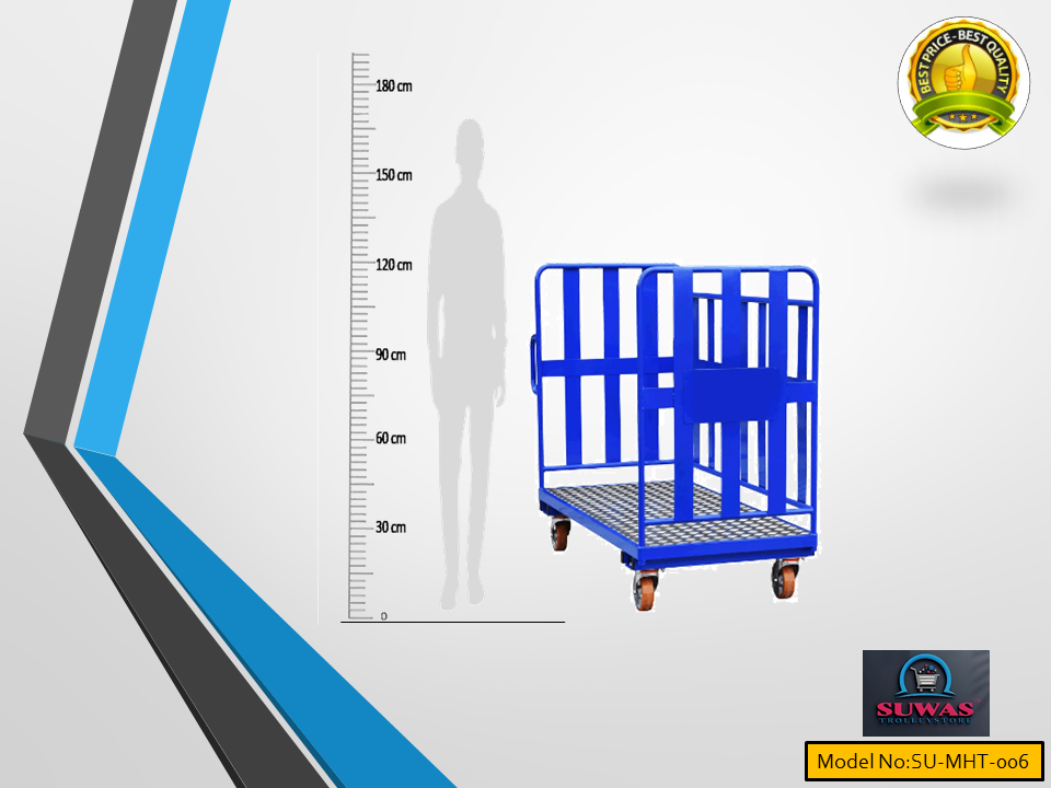 Strong & durable mild steel heavy duty Material Handling Trolley. Trolley engaged with 6” x 2” PP (Polypropylene) fixed Castor wheels at front & swivel with brake castor wheel at rear end for indoor and moderate outdoor easy & safe handling. Tubing and each shelf made of tough steel for added durability.