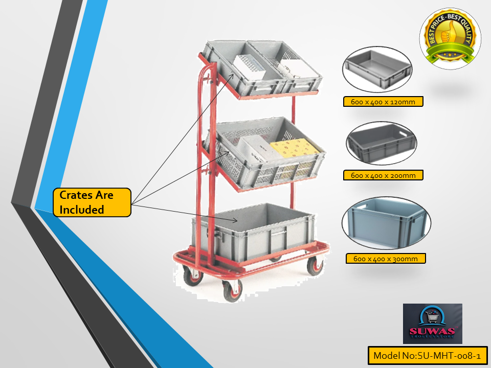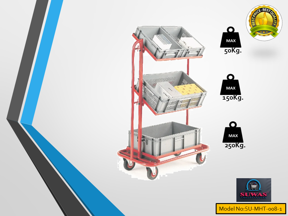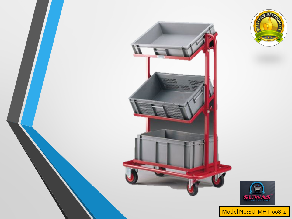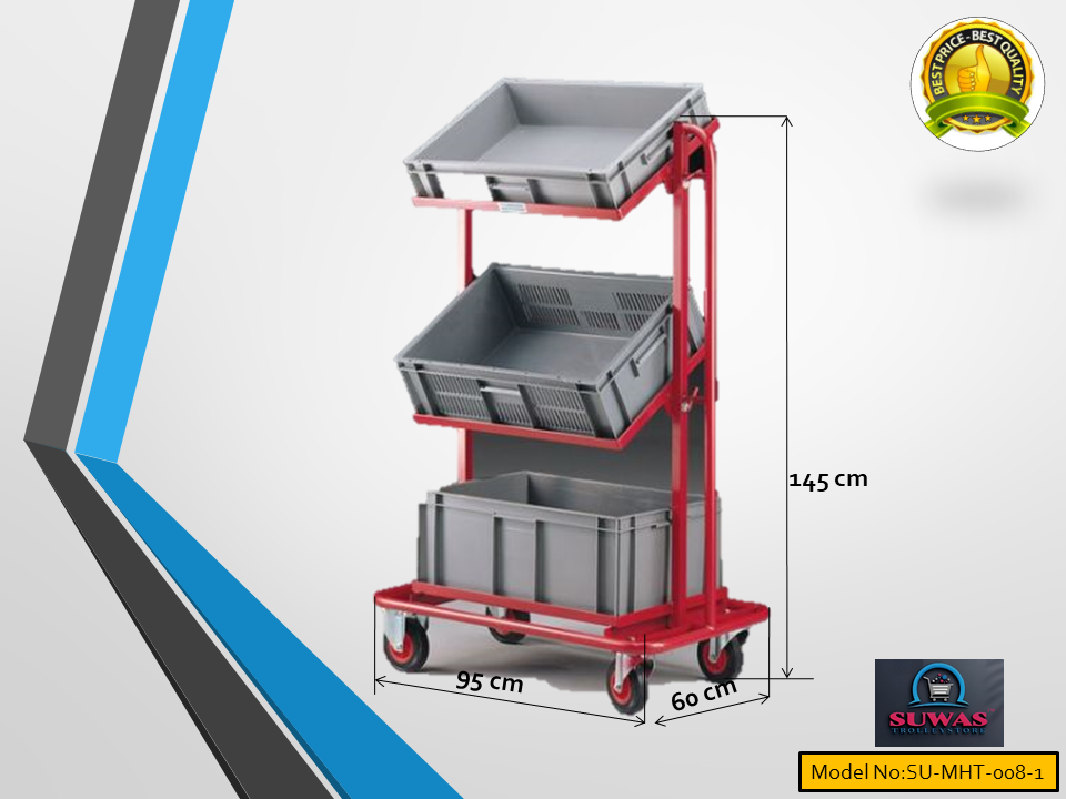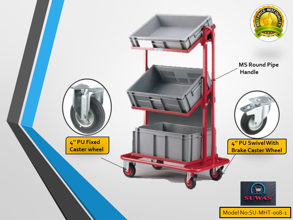 Heavy duty Material Handling Trolley. Trolley engaged with 4” duty PU (Polyurethane) fixed castor wheels at front wheel & swivel with brake castor wheel at rear end for indoor and moderate outdoor easy & safe handling. Tubing and each shelf made of tough steel for added durability.