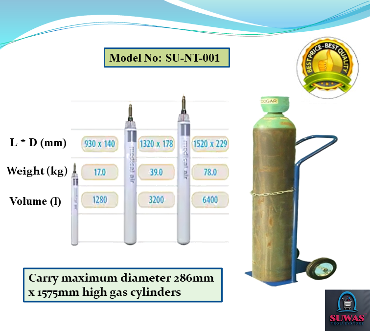 Cylinder trolley with tubular steel frame designed to carry maximum 286mm diameter x 1575mm high gas cylinders. Gas cylinder trolley frames are fitted with locking chain increased manoeuvrability and stability when in transit.