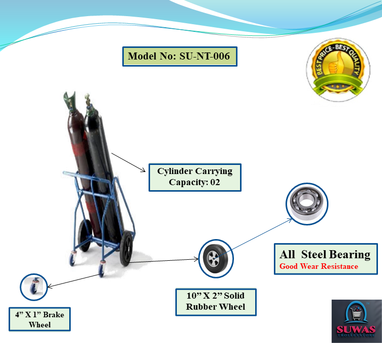 Cylinder trolleys with tubular steel frame designed to carry maximum 286mm diameter x 1575mm high gas cylinders. Gas cylinder trolley frames are fitted with locking chain increased manoeuvrability and stability when in transit.