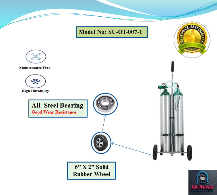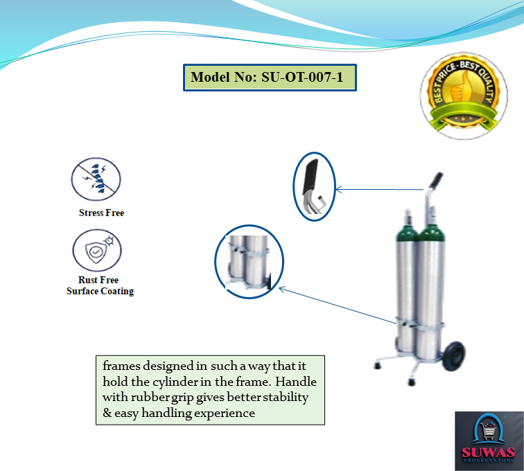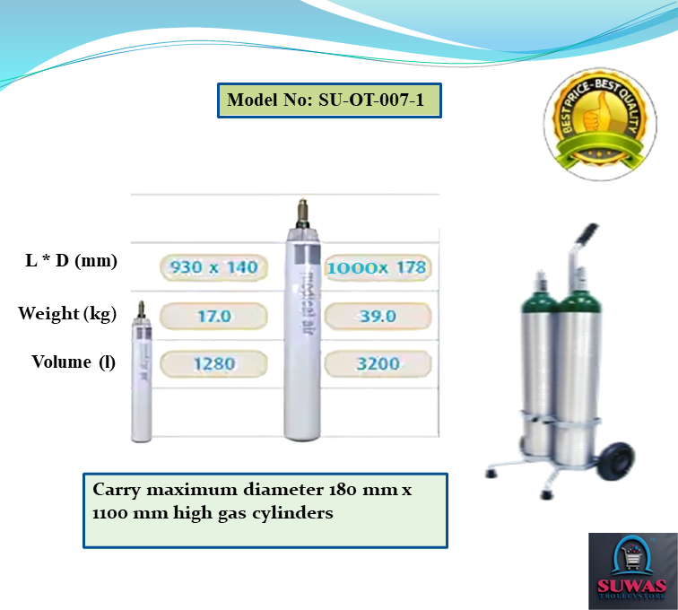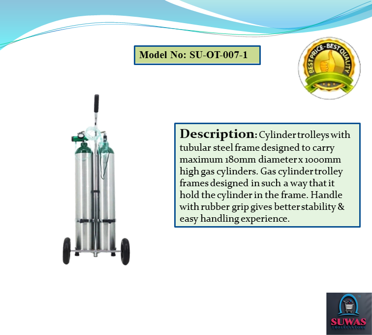 Cylinder trolleys with tubular steel frame designed to carry maximum 180mm diameter x 1000mm high gas cylinders. Gas cylinder trolley frames designed in such a way that it hold the cylinder in the frame. Handle with rubber grip gives better stability & easy handling experience.