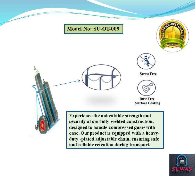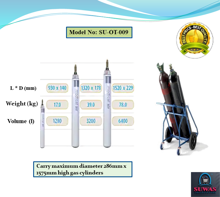 Cylinder trolleys with tubular steel frame designed to carry maximum 286mm diameter x 1575mm high gas cylinders. Gas cylinder trolley frames are fitted with locking chain increased manoeuvrability and stability when in transit.
