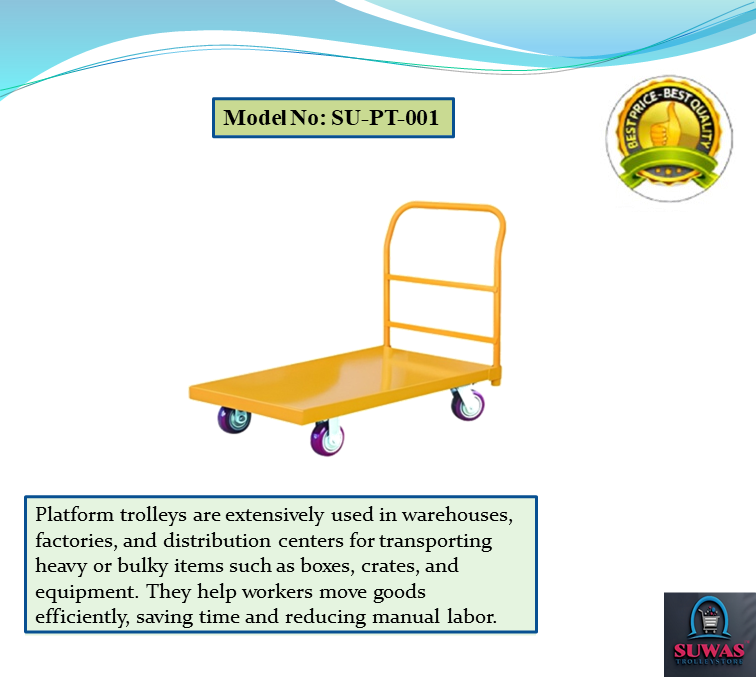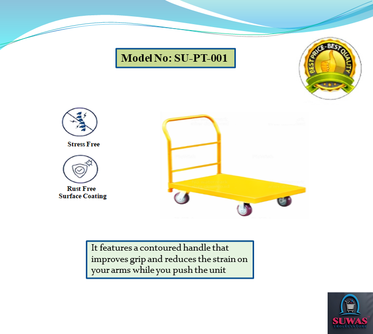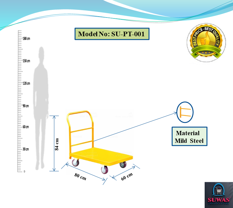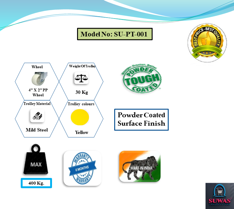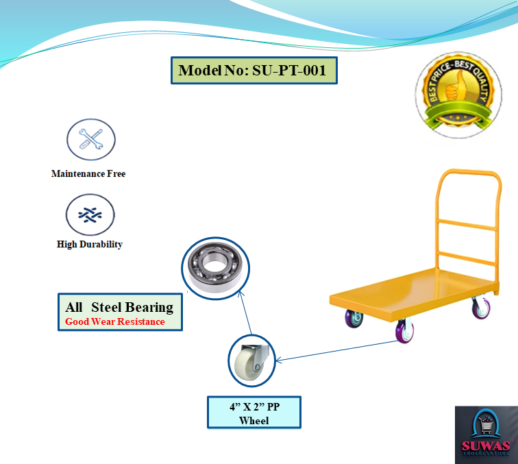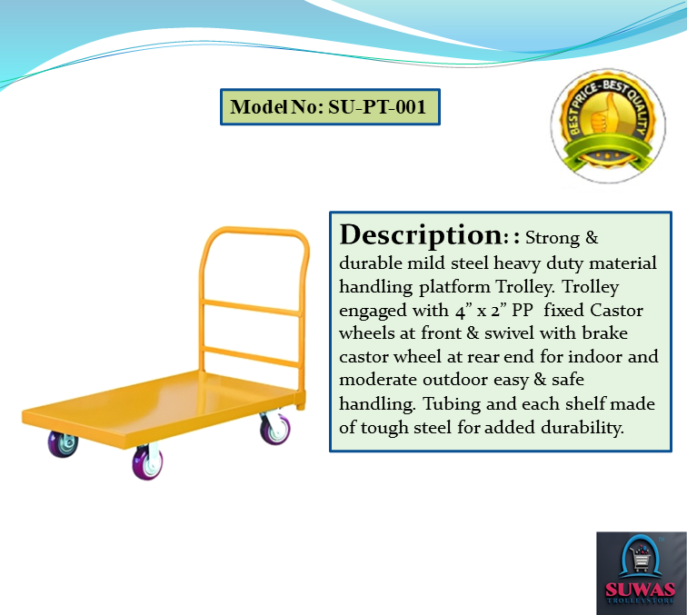 Strong & durable mild steel heavy duty material handling platform Trolley. Trolley engaged with 4” x 2” PP (Polypropylene) fixed Castor wheels at front & swivel with brake castor wheel at rear end for indoor and moderate outdoor easy & safe handling. Tubing and each shelf made of tough steel for added durability.
