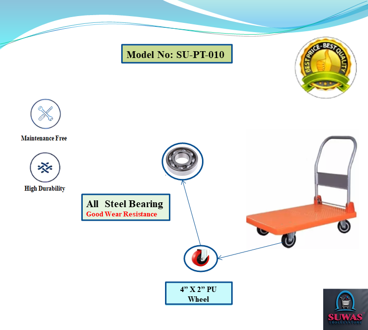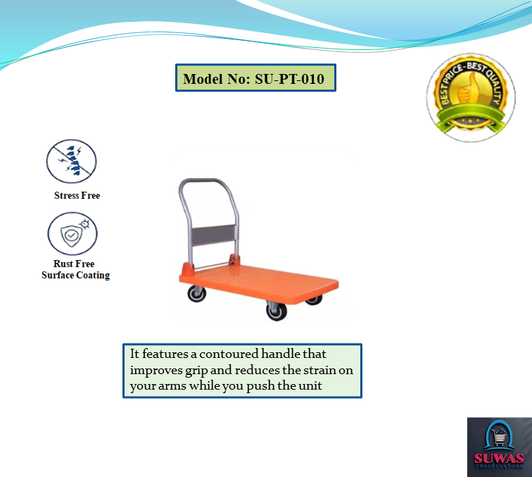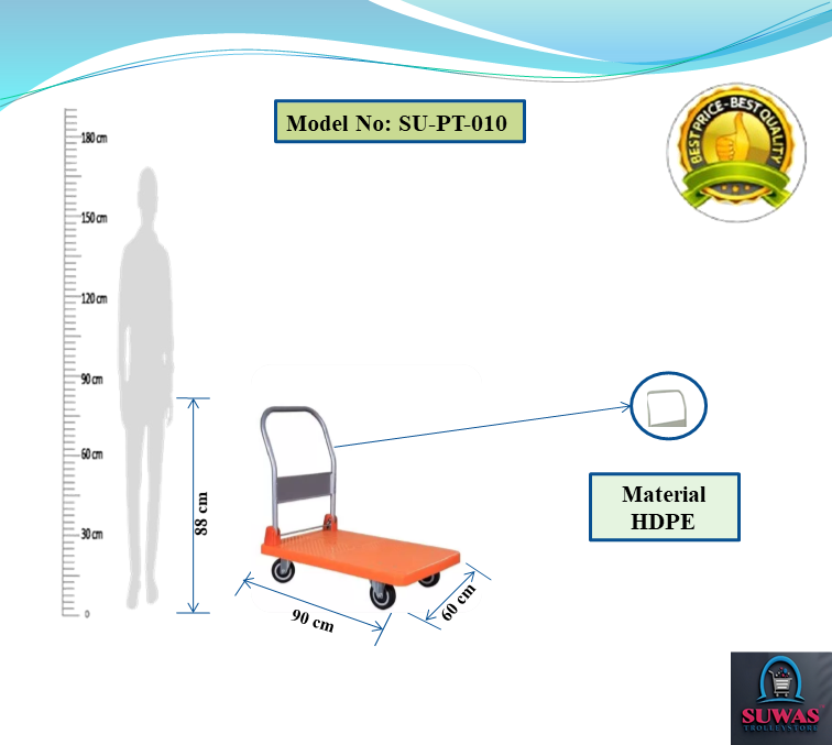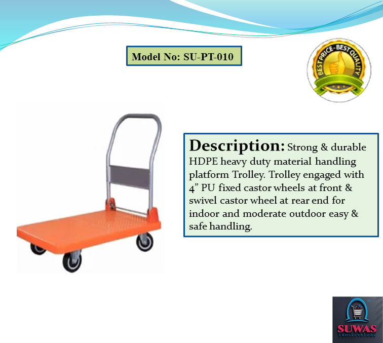 Strong & durable HDPE heavy duty material handling platform Trolley. Trolley engaged with 4” PU fixed castor wheels at front & swivel castor wheel at rear end for indoor and moderate outdoor easy & safe handling.