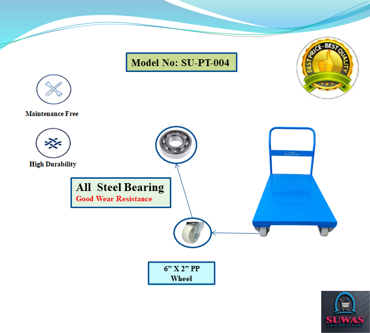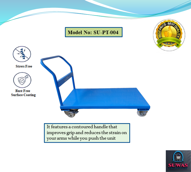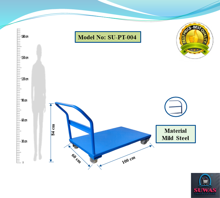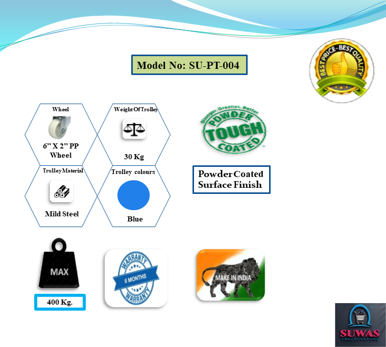 Strong & durable mild steel heavy duty material handling platform Trolley. Trolley engaged with 6” x 2” PP (Polypropylene) fixed Castor wheels at front & swivel with brake castor wheel at rear end for indoor and moderate outdoor easy & safe handling. 18mm High strength compressed plywood on platform.