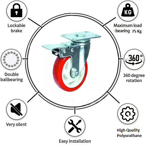 3” x 1.25” 75Kg. Loading Capacity PU (Polyurethane) Brake Castor Wheel